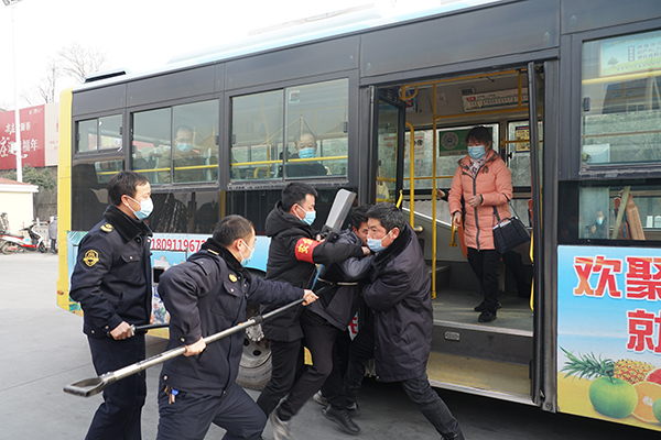 在火車站首末站,恰逢一車隊(duì)工作人員正在開展疫情防控應(yīng)急演練,一未佩戴口罩的乘客欲乘車,駕駛員制止后,該乘客非但不聽,強(qiáng)行上車后辱罵、持刀相向駕駛員,駕駛員隨即將情況報告車隊(duì)長并報警,車隊(duì)安保人員將其制服。看完演練后,熊衛(wèi)軍、錢萬輝對工作人員面對突發(fā)事件的應(yīng)急處置能力點(diǎn)贊。