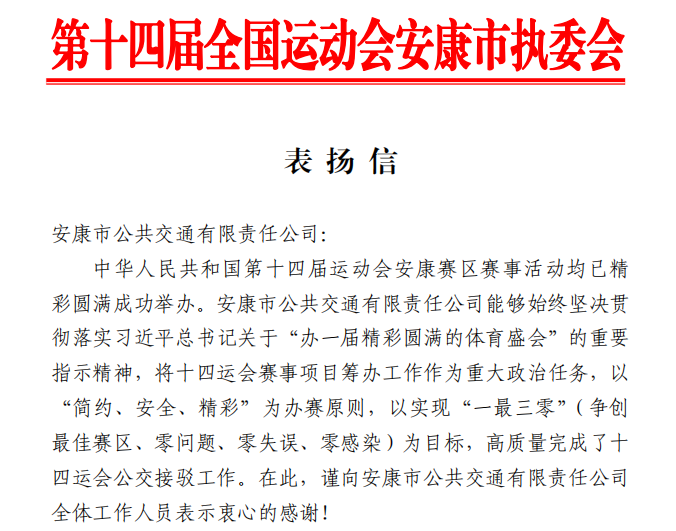 近日,第十四屆全國運動會安康市執(zhí)委會向市公交公司發(fā)來表揚信,對公交公司高質量完成十四運會公交接駁工作表示感謝。