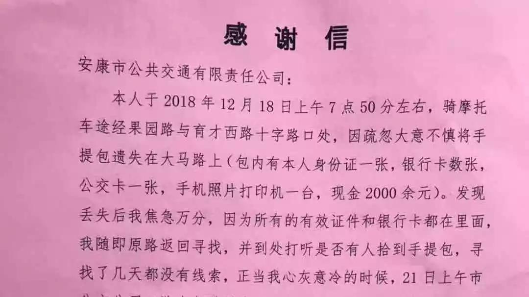 據(jù)失主吉某介紹,她是在12月18日早上的7點50分左右,騎摩托車途徑果園路與育才西路十字路口處,不慎將手提包遺失在馬路上。發(fā)現(xiàn)包丟失之后焦急萬分,隨即原路返回尋找,并四處打聽是否有人拾到手提包,尋找了幾天都沒有線索,正當她心灰意冷的時候,接到了李師傅的電話。兩人確認后,當天下午,失主吉某來到安康市公交公司領取自己遺失的手提包。并將一面印有“拾金不昧品德高尚”的錦旗和一封感謝信送到公交公司車隊辦公室。